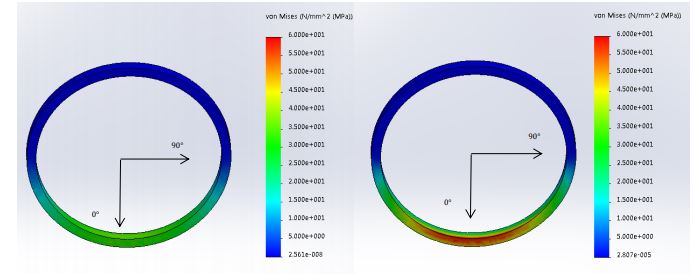 Die FEA-Ergebnisse zeigen niedrigere Spannungen im Verbundstoff (links) im Vergleich zur Bronze (rechts).