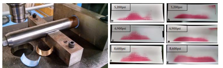 Experimentelle Bestätigung: Zur Bestätigung von Computersimulationsmodellen wurde ein Experiment durchgeführt, bei dem Bronze- und Kompositbuchsen mit jeweils 25 mm Durchmesser einer Biegebeanspruchung ausgesetzt wurden – ähnlich wie im realen Betrieb. Die berechneten projizierten Kontaktspannungen betrugen 5.200 psi, 6.900 psi und 8.600 psi. Zwischen Stab und dem Muster wurde ein Druckkontaktfilm angebracht. Wie die Ergebnisse unten zeigen, war die Druckverteilung auf dem Verbundwerkstoff gleichmäßiger, während die Bronze Hinweise auf Spannungen in der Nähe der Vorderseite der Ladefläche aufwies.